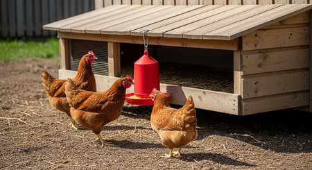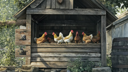 Group of chickens standing at the entrance of a wooden coop, enjoying the sunlight filtering through the cracks in the door, creating a rustic farm scene