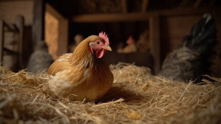 Group of chickens in wooden coop with straw bedding and soft lighting. That the image is generated using AI.