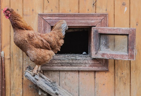 chicken comes out of the chicken coop.