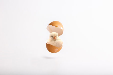 Cute little brown chicken coming out of a white egg isolated on white