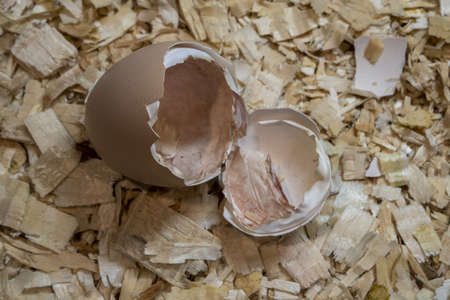 Chopped eggshell. It marks the days past. Traces of chicken are visible from the shell. Chicken hatching. On white background.