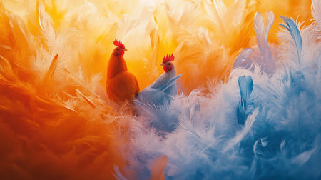 A charming and whimsical scene featuring two colorful chickens amidst a backdrop of vibrant orange and blue feathers, creating a playful atmosphere.