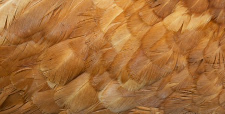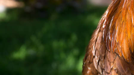 Selective focus on the golden brown feather of a hen located on a farm in the countryside. Copy Space. Agriculture.