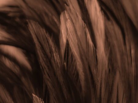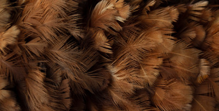 The feathers of a chicken are shown in detail, with a focus on the red and brown colors. Concept of warmth and natural beauty, as the feathers are intricately detailed and appear to be in motion