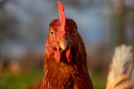 Close up portrait (blurred background) of brown hen in the garden on sunny day. Beautiful hen with pretty eyes looking and posing to camera on barnyard. Chicken resting on the meadow at sunset.