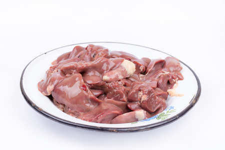 Raw chicken liver in the metal plate over white