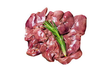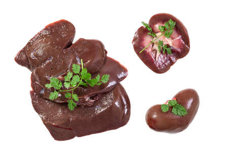 Raw liver chicken offals meat Isolated on white background, top view
