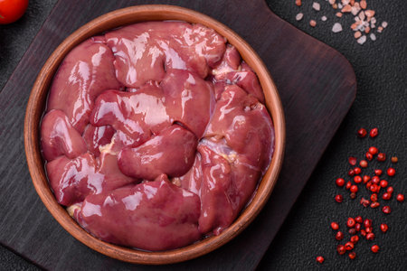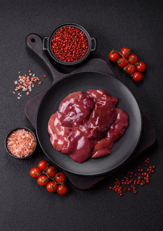 Fresh raw chicken or beef liver with salt, spices and herbs on a dark concrete background