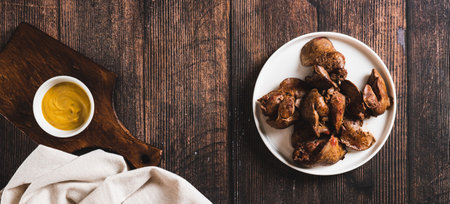Homemade stewed chicken liver on a plate on the table top view web banner