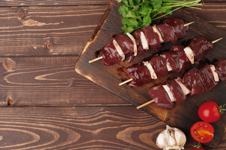 Raw beef liver kebab on skewers on wooden board