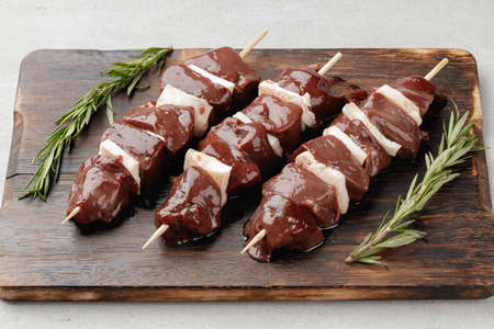 Raw beef liver on skewers on board
