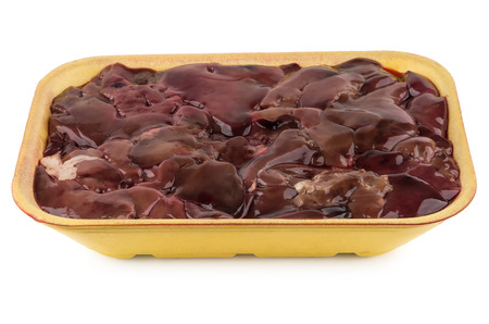 Yellow plastic tray with chicken liver isolated on white background