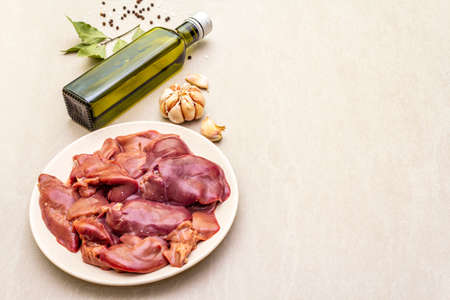 Raw chicken liver with spices on a stone background. Garlic, olive oil, black pepper, bay leaf, copy space