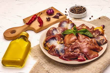 Fresh raw chicken offal: heart, liver, stomach. Dry spices, sea salt, chili pepper, olive oil, fresh mint. White putty background, close up