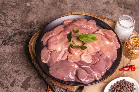 Raw chicken liver. A useful ingredient for preparing healthy food. Spice set, wooden stand. Trendy concrete stone background, top view
