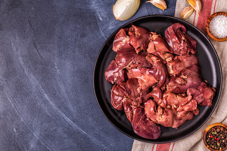 Fresh raw chicken or turkey liver in a ceramic plate with salt, spices and herbs on a dark concrete background