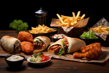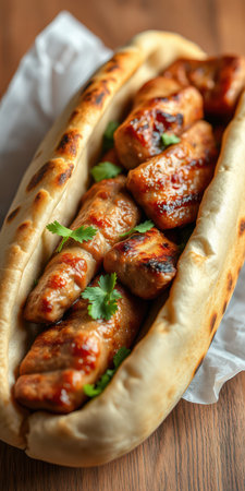 Wrap chicken or tasty kebab with vegetables on wooden