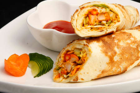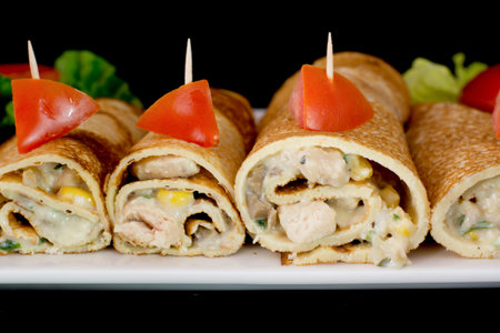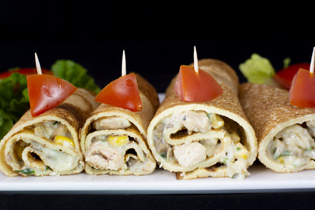 Chicken pancake with salad inside with isolated black background