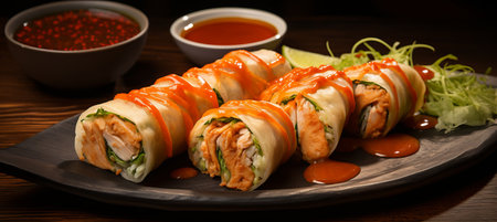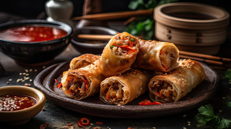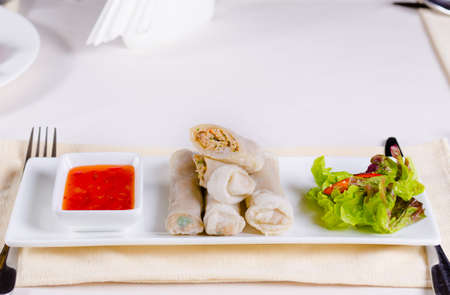 Fried chinese spring rolls with sweet chili sauce on background
