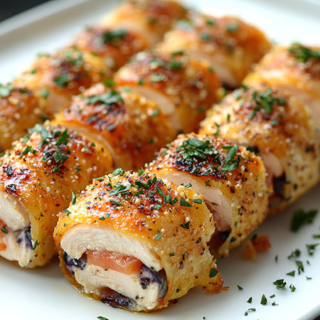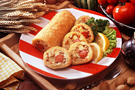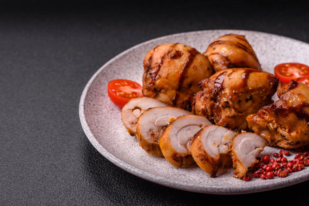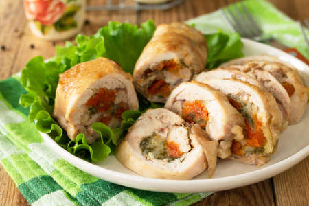 Delicious fresh meat roll made from chicken fillet, mushrooms, spices and herbs. Delicious healthy dish cooked at home