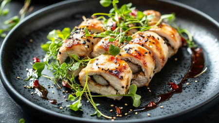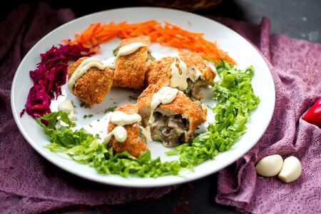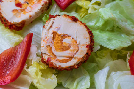 chicken roulade stuffed with meat on lettuce