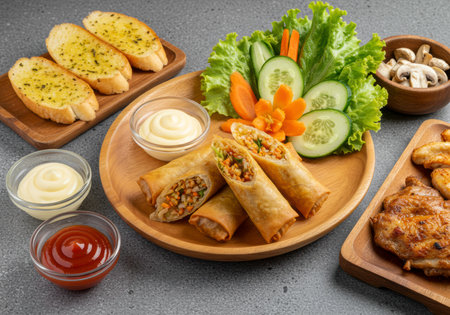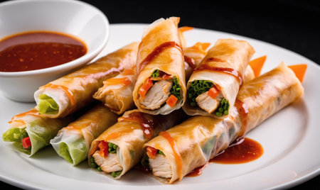 healthy plant-based food recipes concept, vegan spring rolls with soy sauce