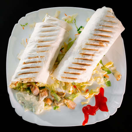 Two burrito, black and white lavash with chicken, mushrooms, salad, cherry tomatoes, lime, and salsa. Copy space, selective focus