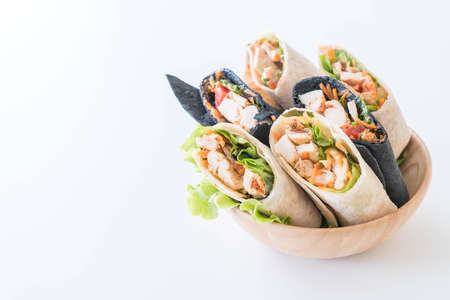 Tortilla wrap with chicken and vegetables on blue background. Toned.