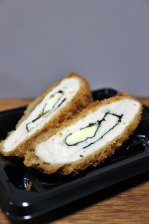 Fried chicken fillet stuffed with shiso leaves and cheese purchased at a supermarket in Tokyo, Japan