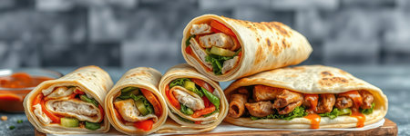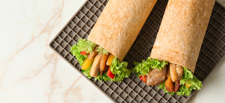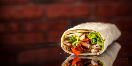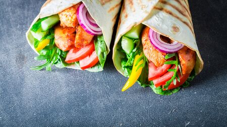 Mexican tortilla grilled wrap with chicken breast and vegetables on concrete background