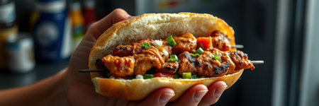 Delicious chicken wrap held in hand at outdoor market
