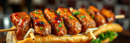 Grilled chicken on bamboo skewers, close up view. Catering