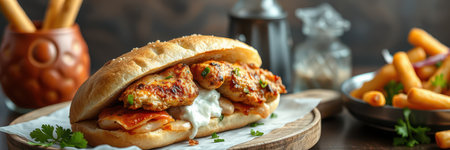 Delicious Fried Chicken Steak with Lettuce And Tometo Served on Wooden Table on Dark Background. Free Space for Text.
