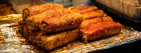 Grilling barbecue meatloaf rolled with vegetables, pork or beef at traditional night market stall, delicious street food in South Korea.