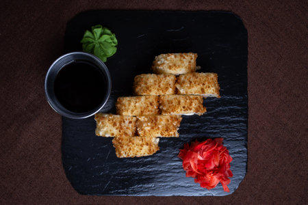 Deep-fried sushi roll on black stone plate with soy sauce, wasabi. Made with rice, seaweed, vegetables, shrimp tempura.