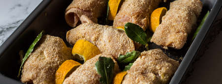 chicken rolls with smoked scamorza cheese and cooked ham and passed in breadcrumbs. Baked with bay leaf and lemon slices