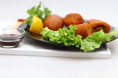 Homemade kibbeh and snacks on a porcelain plate