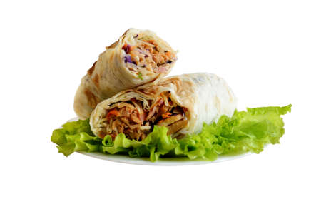 Chicken shawarma roll with grilled meat, Mozzarella cheese, French fries, Chinese cabbage, cucumbers, Korean carrots, greens wrapped in thin lavash bread. Isolated. Street food eastern sandwich.