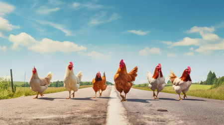 Group of chickens walking on the road in the countryside