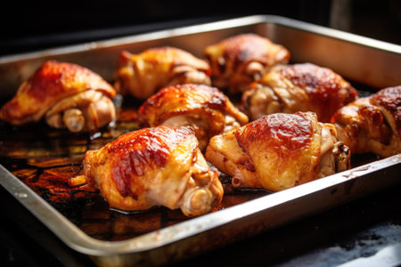 fully cooked chicken thighs resting on a roasting tray, created with generative ai