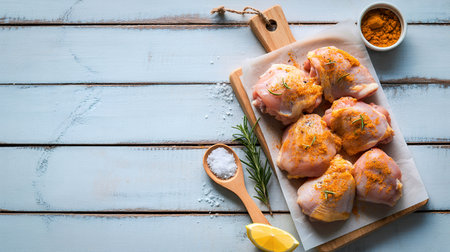 Raw chicken thighs with salt, spices and herbs prepared for grilling