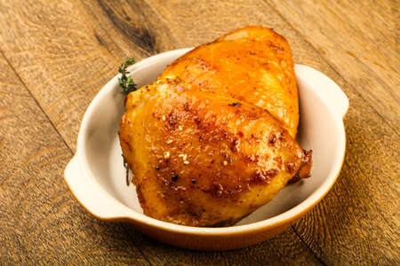 Roasted chicken thighs on baking sheet pan. Cooked Baked chicken parts lies on wooden table. Close up. top view
