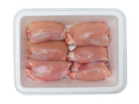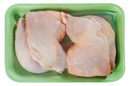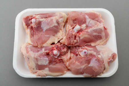 Chicken thighs in food plastic tray for sale in supermarket, isolated on gray background, clipping path