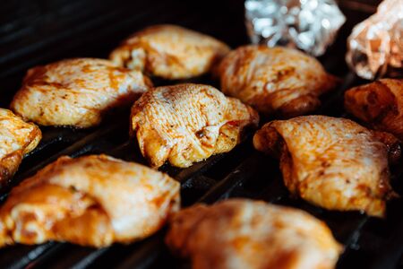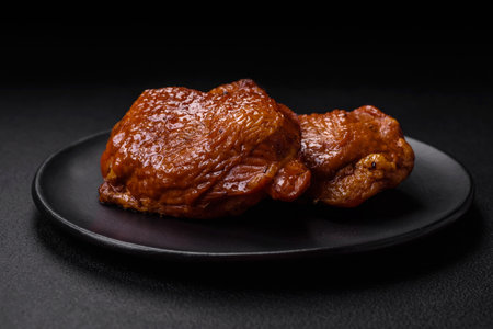 Delicious fried or smoked chicken thighs grilled with spices and herbs on a dark concrete background