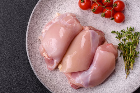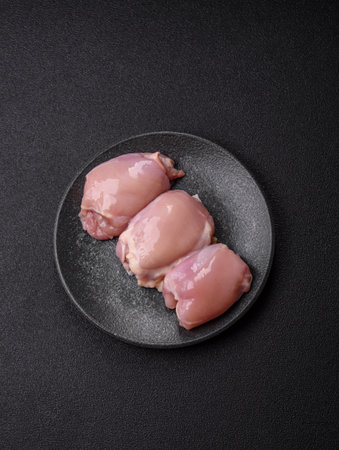 Fresh raw chicken thigh fillets with salt, spices and herbs on a dark concrete background