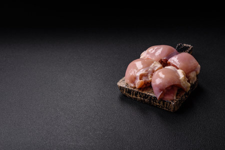 Raw chicken thighs with spices. A useful ingredient for preparing healthy food. Black stone background, trendy hard light, dark shadow, flat lay