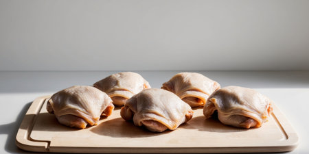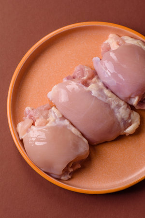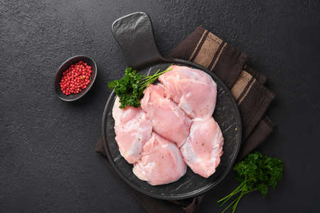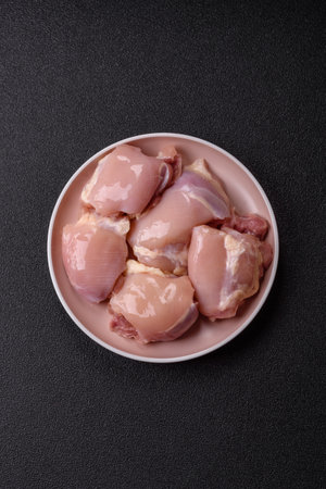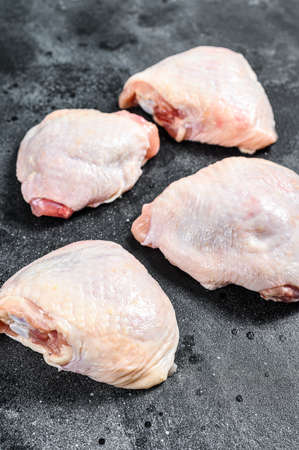 Raw chicken thigh fillet, poultry meat as a source of protein. Chicken thigh fillet as a food background for your design.