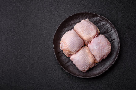 Fresh raw chicken thighs with salt and spices on dark concrete background