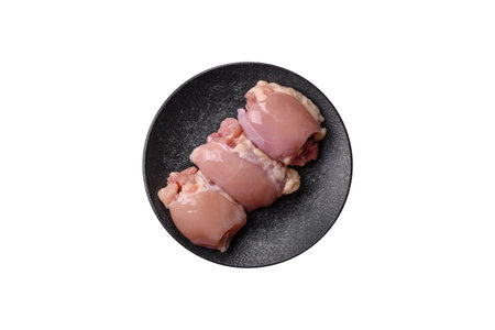 Meat, raw chicken thigh, leg in skin with salt and spices. Raw chicken thigh meat for food background
