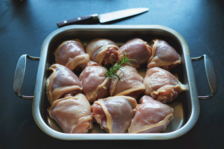 Juicy chicken thighs are seasoned with fresh herbs and spices, beautifully arranged on a baking tray ready for roasting in the oven. Perfect for dinner.